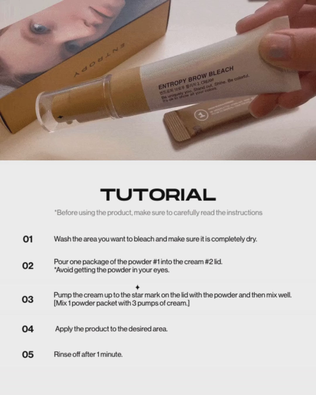 Experience the tone-up effect with Entropy Brow Bleach, a hair dye that naturally brightens dark brow hairs. Experience a noticeable change in your look, in the comfort of your home, within a short amount of time. No damage caused to the skin. *Individuals may experience variations depending on brow hair volume and thickness.