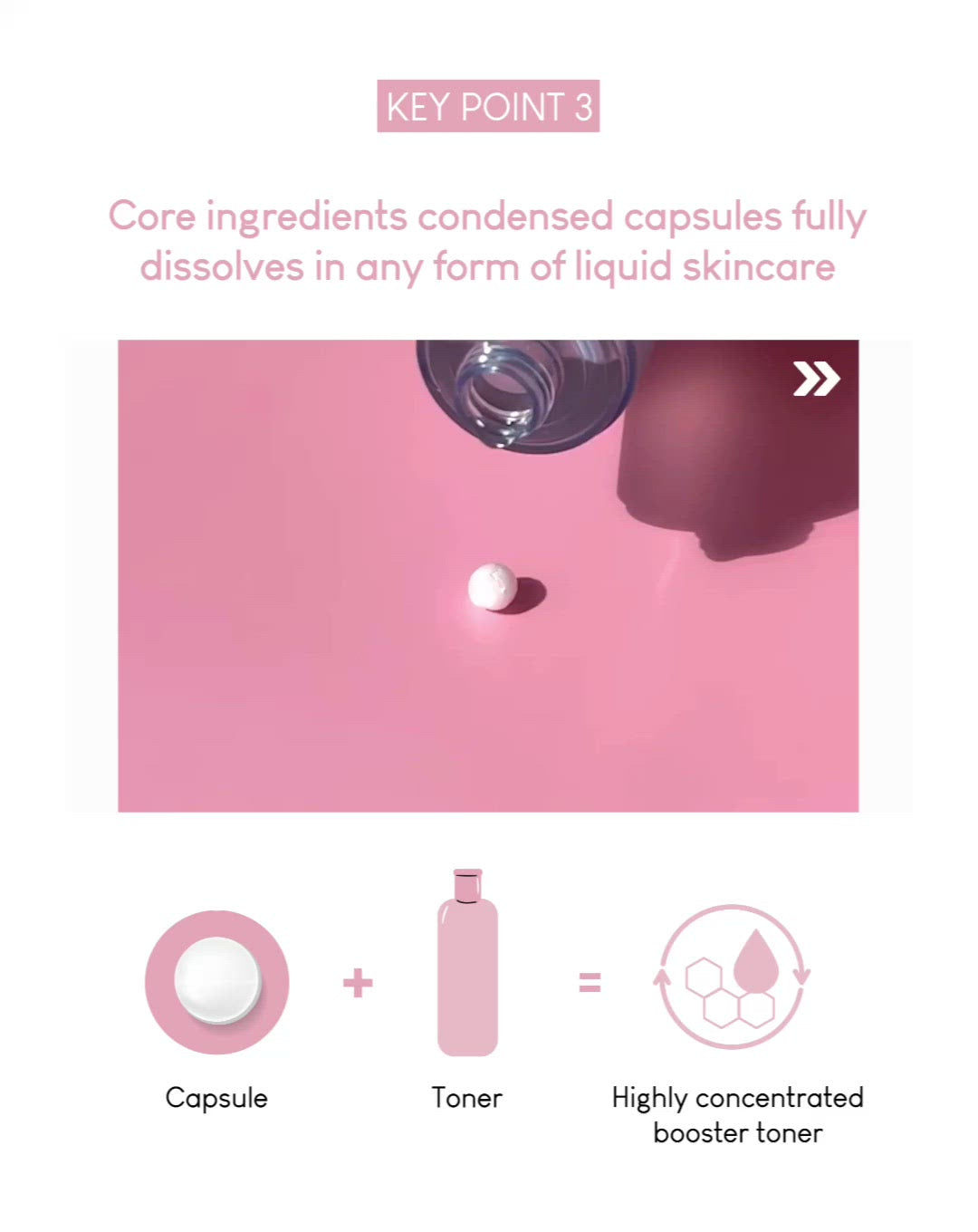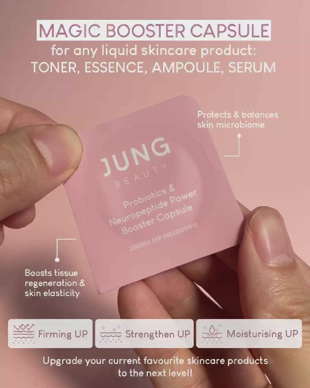 This premium & advanced formulation capsule boosts the effects of any preferred liquid skincare product (e.g. toners, essences, ampoules, serums) when mixed together. For a daily anti-aging and skin barrier protecting booster before the rest of your skincare routine, mix the capsule with any preferred liquid skincare product.