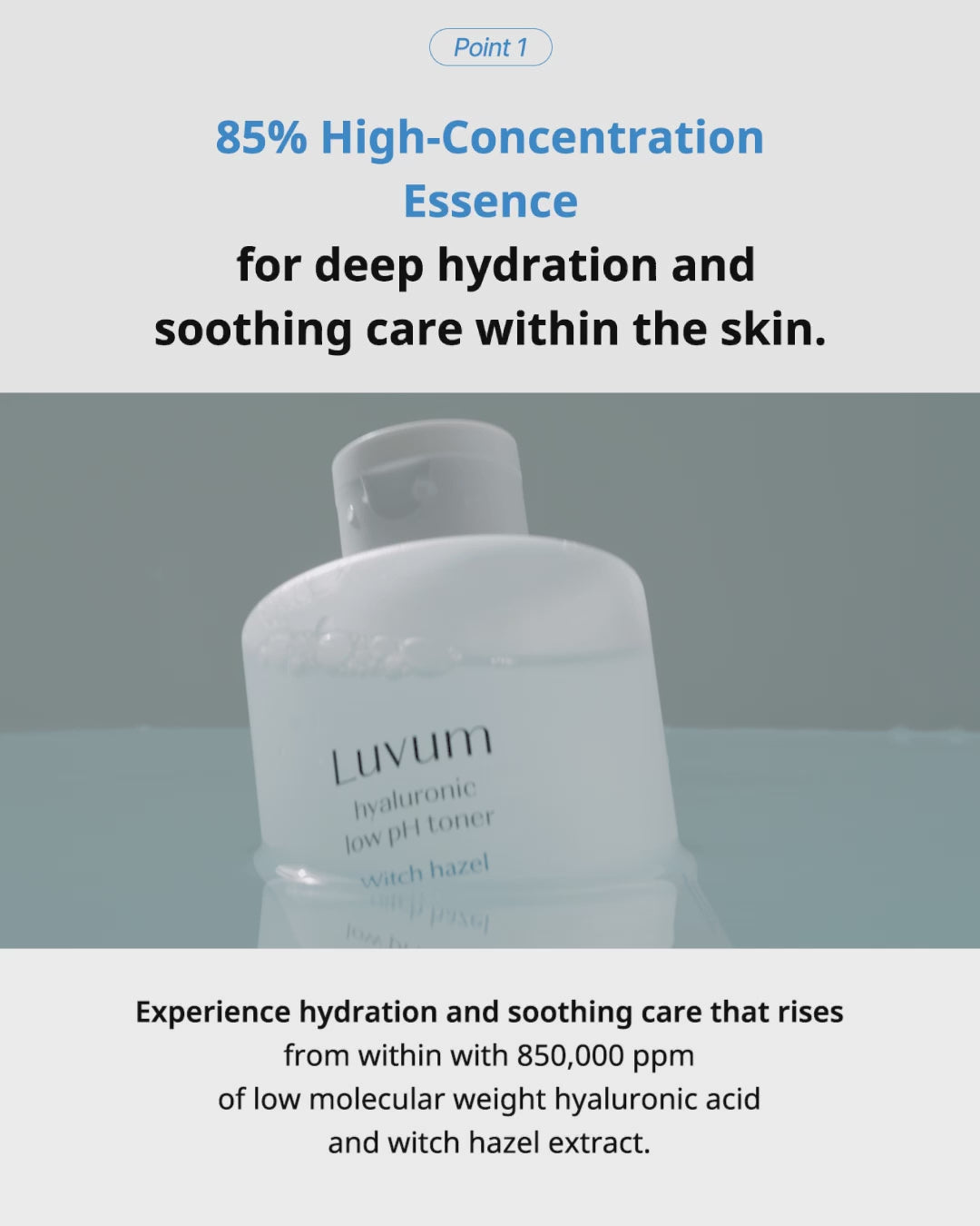🩵 85% high-concentration essence offers deep hydration and soothing care with 850,000 ppm of low molecular weight hyaluronic acid and witch hazel extract.