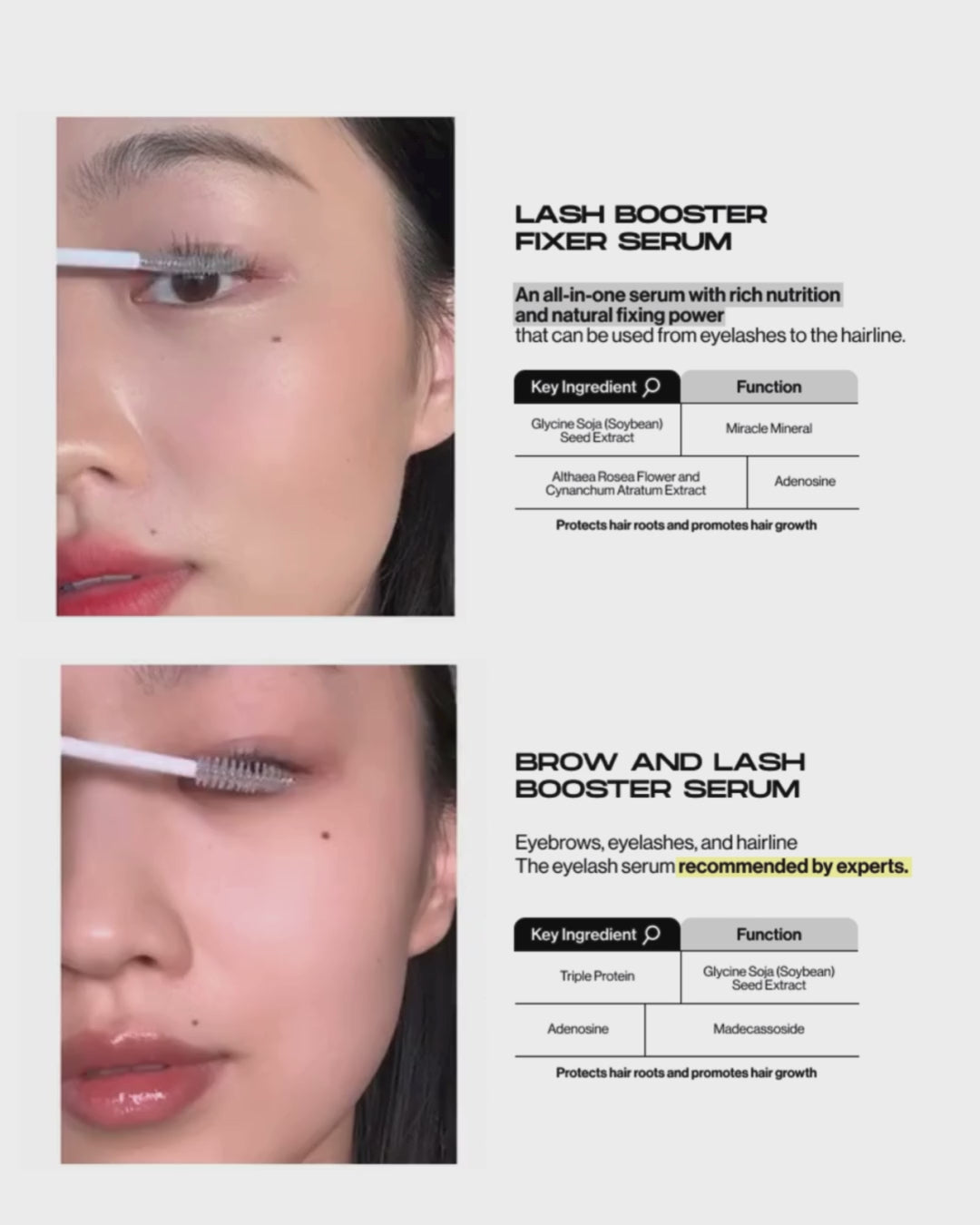 Lash Booster Fixer Serum, an all-in-one serum with rich nutrition and natural fixing power. It provides strong curling power without stickiness. Protects hair roots and promotes hair growth.