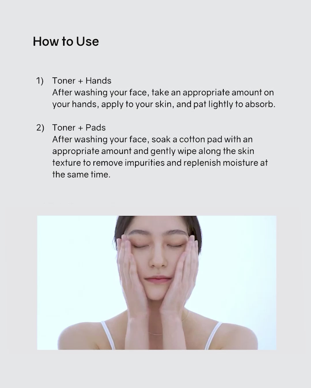 - After cleansing, pour an appropriate amount of toner onto a cotton pad or your palm and apply gently, avoiding direct contact with the eyes.