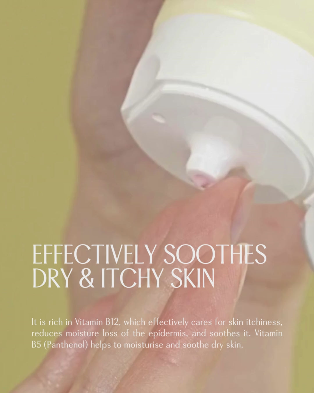 The cream contains Vitamin B5, also known as panthenol, which helps moisturize the skin, and a red-coloured water-soluble form of Vitamin B12 called cyanocobalamin, which effectively soothes skin itching.